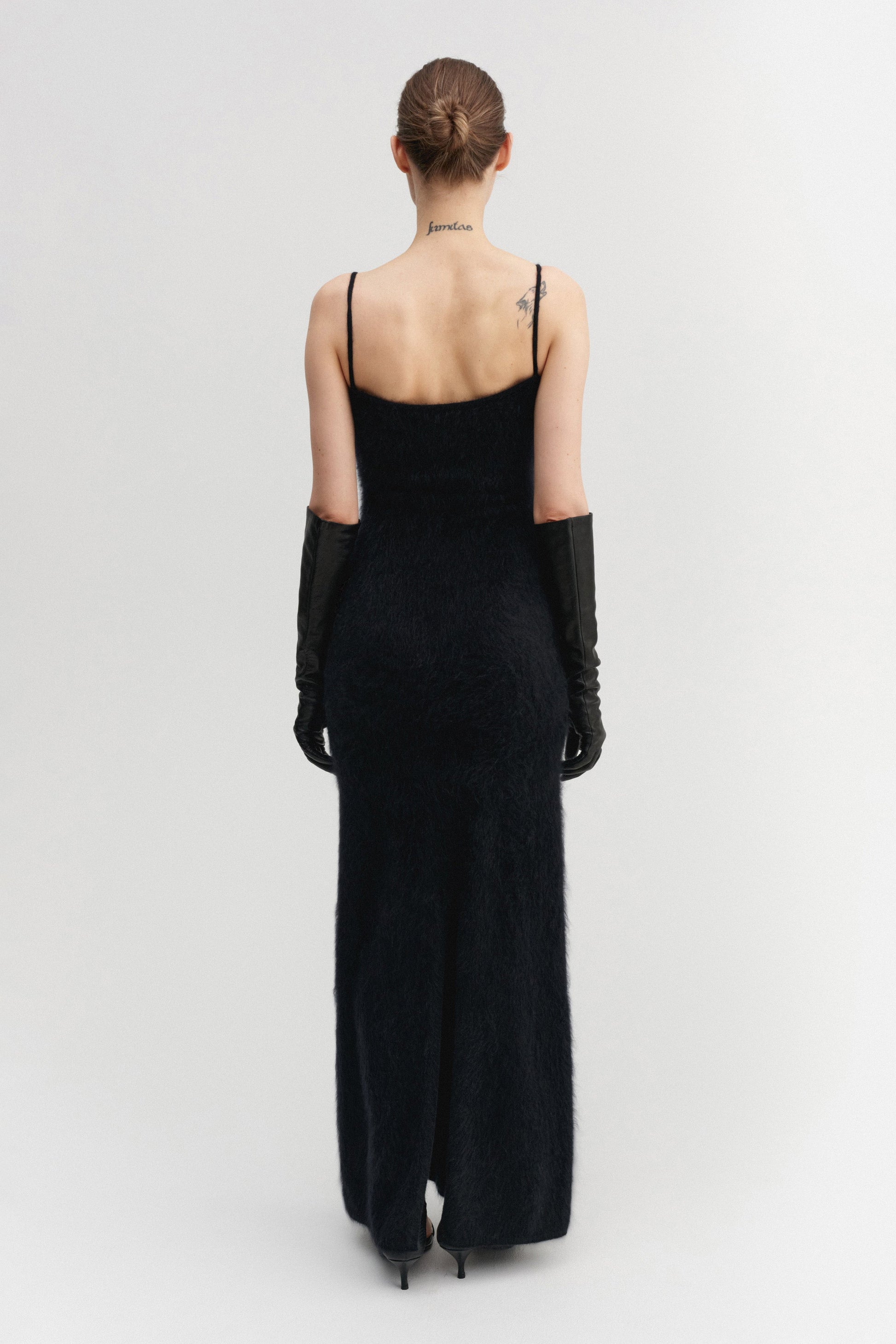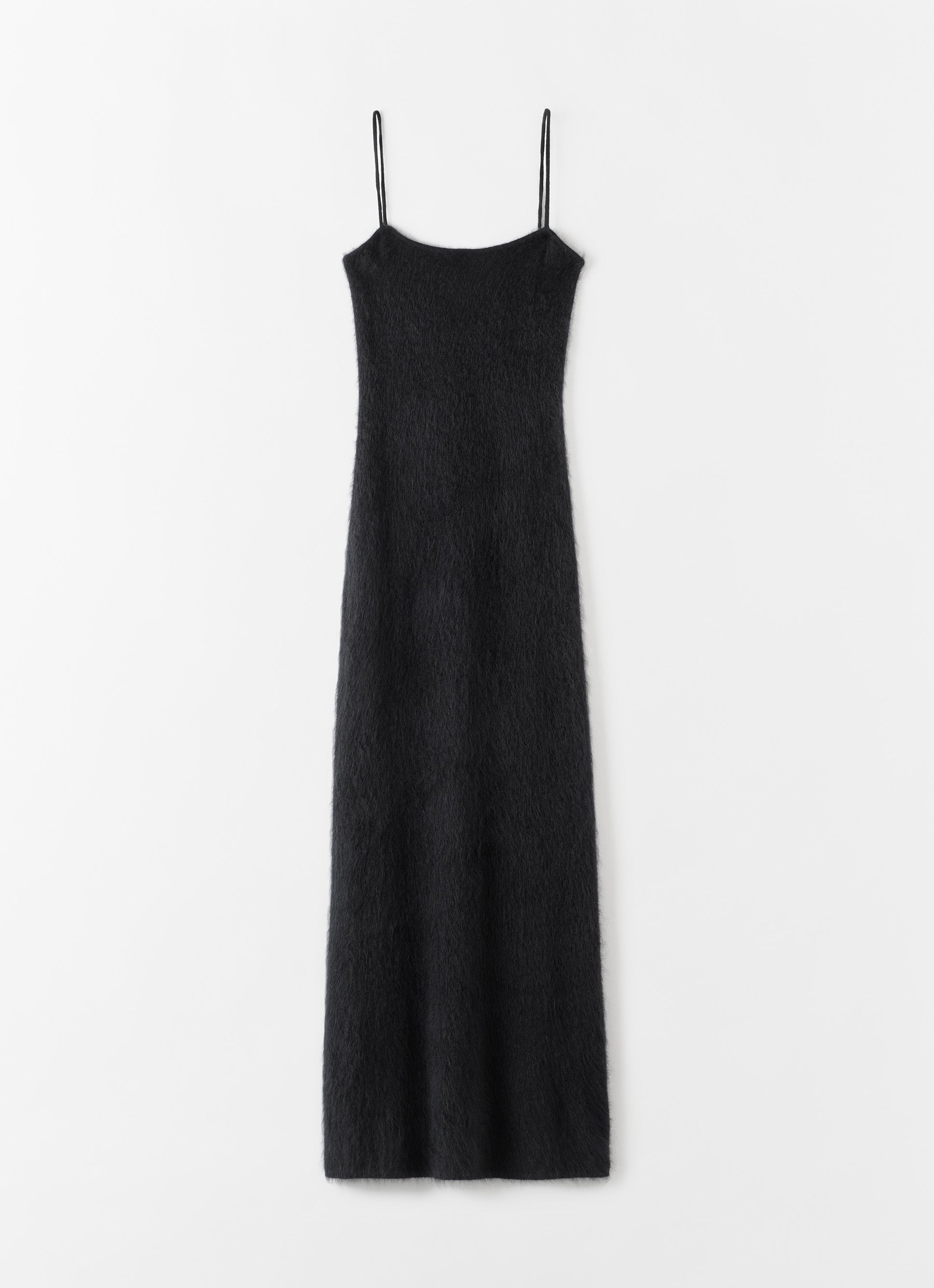 El vestido Fiona está tejido con cachemira cepillada super suave y tiene un acabado peludo pero suave. Tiene un corte femenino ajustado con una sutil silueta en forma de A. Cuenta con tirantes estrechos.